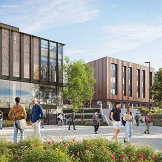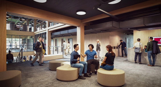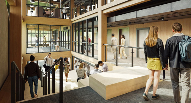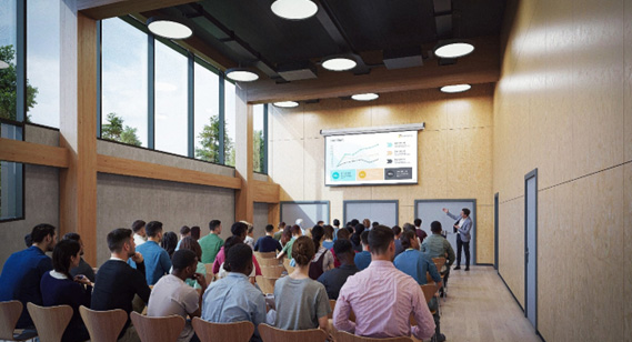 The net-zero building is at the centre of our efforts to become more sustainable as a university. It features solar panels and other renewable energy sources, and is also accessible from every level of the Student Village.