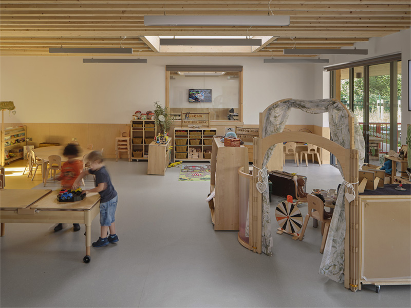 Natural light fills the rooms through large windows and doors, keeping children connected to the outdoors and the changing seasons. Materials are thoughtfully chosen, from natural wood and soft textiles to recycled and real-life objects, sparking curiosity while reflecting our sustainability ethos. Children’s independence is encouraged by accessible resources and child-sized furniture, empowering them to make choices and shape their play.