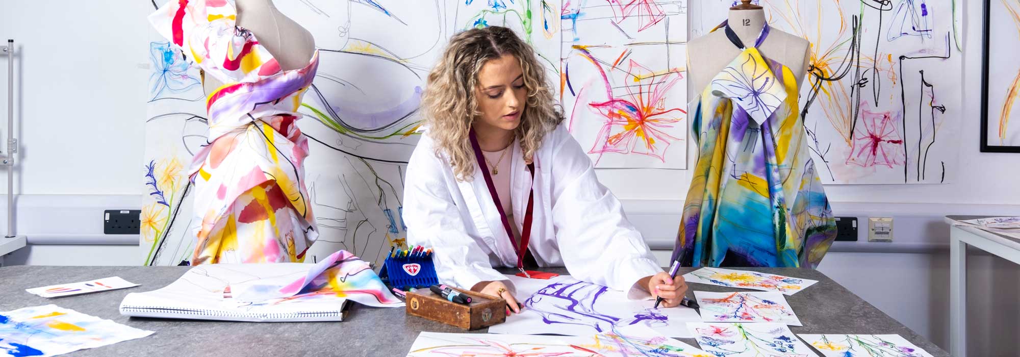 The technical skills you’ll develop include pattern cutting, garment construction and CAD drawing. It will involve designing a fashion print, constructing a garment out of the fabric and then undertaking a professional photo shoot to evidence your design in the best way possible.