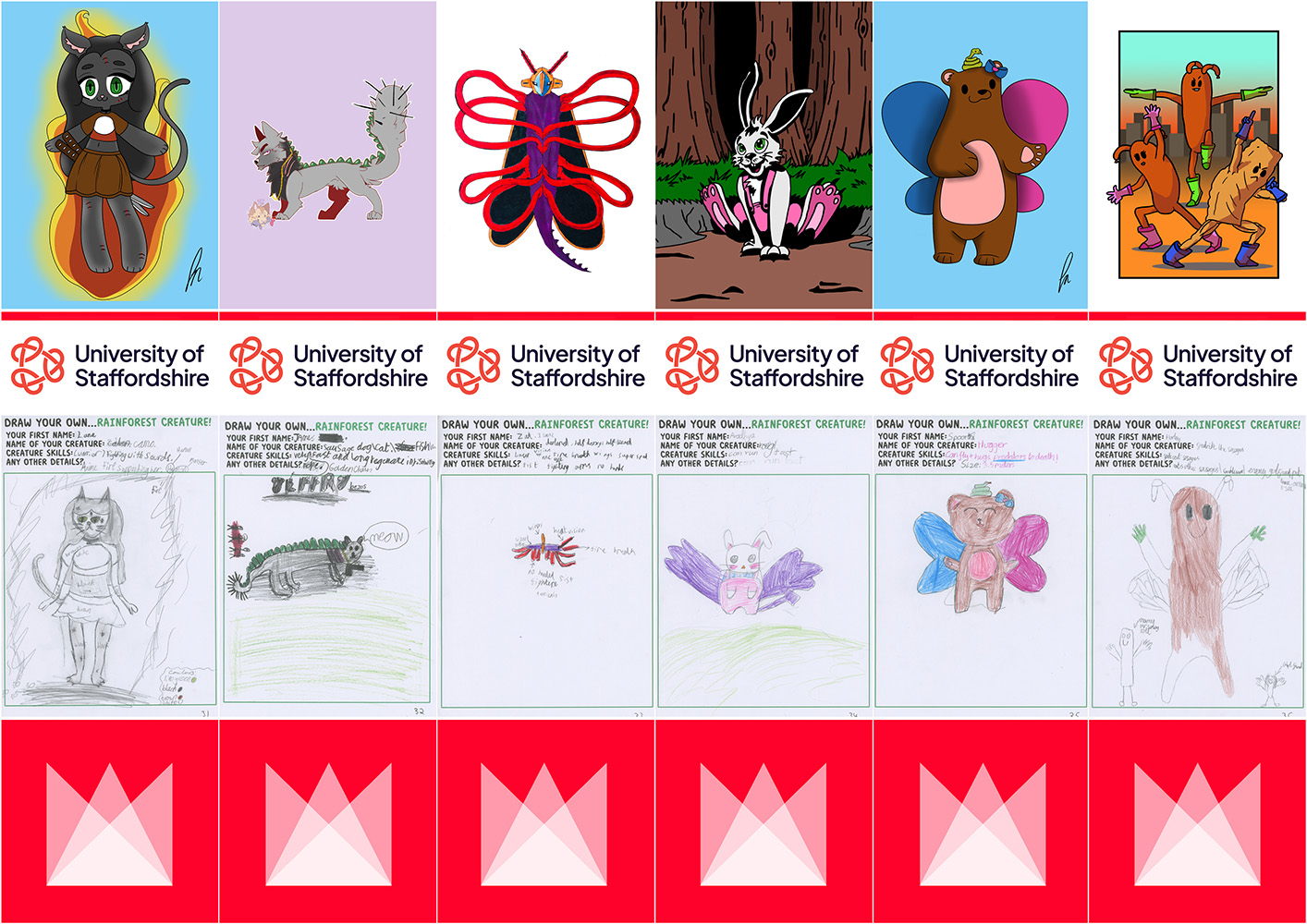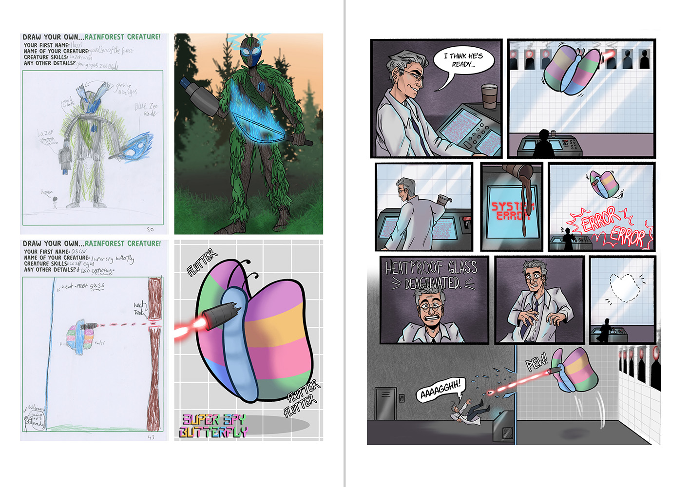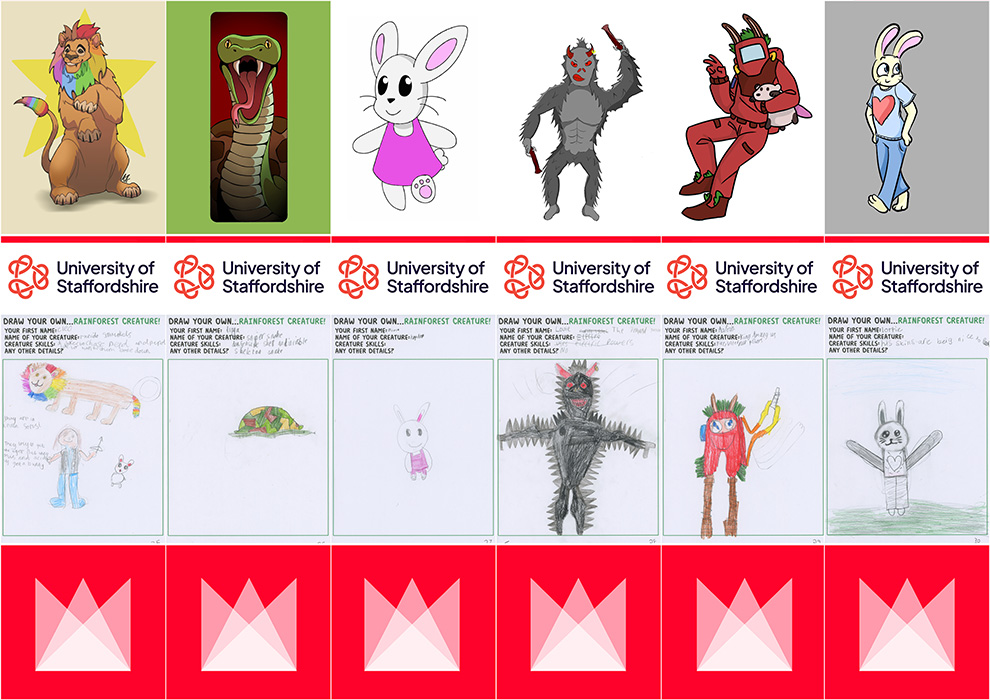 The children are always eager to help the students to develop exciting stories and characters, so each child draws a ‘rainforest creature’ for the students. The good thing about this age group is that their imagination isn’t hampered by physics or logic! As there’s around 60 children and 30 students in the workshop, each student is given two drawings to work with. The students are then tasked with drawing their version of the children’s characters and having those characters then go on a three page adventure.