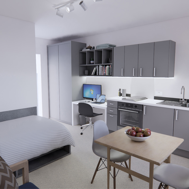 Gold Deluxe (Studio room) Home Student life Accommodation Our accommodation Gold Deluxe (Studio room) Coming in 2026 Our studios offer spacious, self-contained rooms complete with an ensuite bathroom, individual kitchenette and dining area. They’re ideal for students who want a little more privacy and the convenience of having everything within their own space. Plus, you’ll still have access to the shared spaces on the ground floor, so you won’t miss out on those all-important social moments and memories. £233/week £9,553 annually for minimum 42 weeks. Your duration can be extended if required. Bills included All included in the licence fee Self-contained studio With your own kitchenette, dining area and ensuite bathroom Imagery is indicative and not literal. Photos are artistic impressions. Studio room (artistic impression) Student Village (artistic impression) Student Village (artistic impression) Student Village (artistic impression) Student Village (artistic impression) Student Village (artistic impression) What's included? All university managed accommodation is within walking distance of the post room and launderette (pay as you use). Residents also have access to ResLife events, are in close proximity to our on-campus bars and cafes, plus get free membership to our on-campus sports centre. 24 hour security Including on site daytime police officer and SafeZone app Contents insured £10,000 Personal Contents Insurance (T&Cs apply) Free membership At our on campus gym and sports centre Your room Bedframe and mattress (small double) En-suite with shower, toilet, sink and mirror Desk Desk chair Drawers Wardrobe Shelving Pinboard Individual kitchenette individual-living-area Internet access via ASK4 (T&Cs apply) Shared spaces Lounge Dining area Communal laundry facilities What's NOT included TV licence - if you plan on watching live TV, or services that require a licence in your bedroom, it is your responsibility to purchase a TV licence. Location Gold Deluxe rooms are located in our new Student Village at the Leek Road site of our Stoke-on-Trent Campus. Set between our Nature Reserve, and the Nursery and Forest School, the Student Village is an eight minute walk to the Leek Road site centre, and a 15 minute walk from College Road. You can also walk into Stoke town centre where you will find supermarkets, a weekly market, shops, bars and restaurants. Stoke-on-Trent Railway Station is also just an eight minute walk away. Disclaimer Rooms are subject to availability. The Student Village is currently under construction. The images shown in the advertising materials are artistic renderings of the room appearance and are for illustrative purposes only. In the unlikely event that your accommodation is not ready on time, you will still be allocated a room in alternative accommodation and will move to your first choice accommodation as soon as it is available. Sorry, this video requires the use of functional cookies which you have not consented to use. Please update your cookie settings This room will be open for applications in 2026. View all accommodation