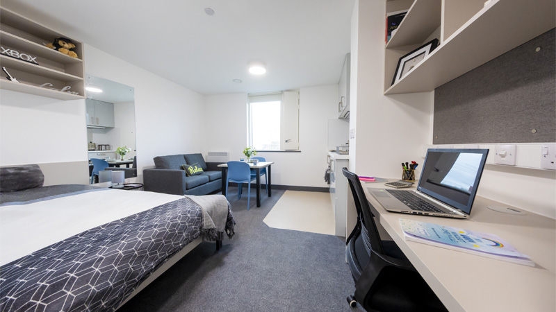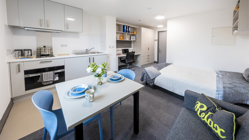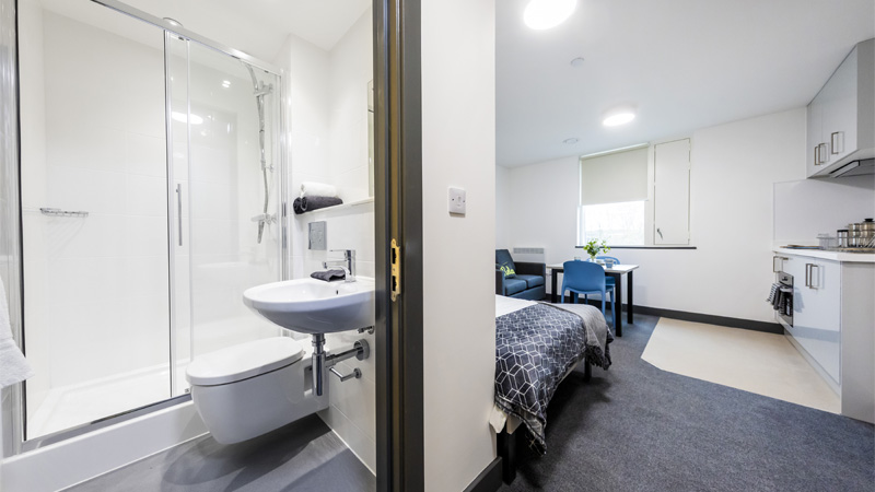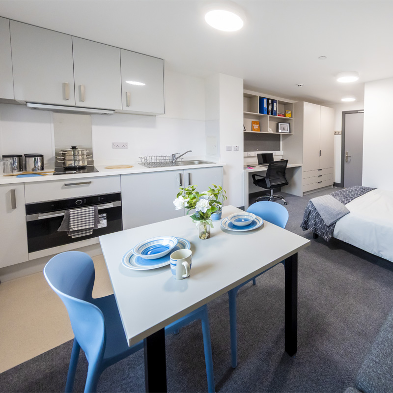 Village Deluxe (Studio room) Home Student life Accommodation Our accommodation Village Deluxe (Studio room) Coming in 2026 Our deluxe studios offer spacious, self-contained rooms complete with an ensuite bathroom, individual kitchenette and dining area. They’re ideal for students who want a little more privacy and the convenience of having everything within their own space. Plus, you’ll still have access to the shared spaces on the ground floor, so you won’t miss out on those all-important social moments and memories. £233/week £9,553 annually for minimum 42 weeks. Your duration can be extended if required. Bills included All included in the licence fee Self-contained studio With your own kitchenette, dining area and ensuite bathroom Imagery is indicative and not literal. Photos are artistic impressions. Studio show room Studio show room Studio show room Kitchen show room Shared space show room Kitchen show room Kitchen show room Shared space show room Studio room (artistic impression) What's included? All university managed accommodation is within walking distance of the post room and launderette (pay as you use). Residents also have access to ResLife events, are in close proximity to our on-campus bars and cafes, plus get free membership to our on-campus sports centre. 24 hour security Including on site daytime police officer and SafeZone app Contents insured £10,000 Personal Contents Insurance (T&Cs apply) Free membership At our on campus gym and sports centre Your room Bedframe and mattress (small double) En-suite with shower, toilet, sink and mirror Desk Desk chair Drawers Wardrobe Shelving Pinboard Individual kitchenette individual-living-area Internet access via ASK4 (T&Cs apply) Shared spaces Lounge Dining area Communal laundry facilities What's NOT included TV licence - if you plan on watching live TV, or services that require a licence in your bedroom, it is your responsibility to purchase a TV licence. Location Village deluxe rooms are located in our new Student Village at the Leek Road site of our Stoke-on-Trent Campus. Set between our Nature Reserve, and the Nursery and Forest School, the Student Village is a five minute walk to the Leek Road site centre, and a 10 minute walk from College Road. You can also walk into Stoke town centre where you will find supermarkets, a weekly market, shops, bars and restaurants. Stoke-on-Trent Railway Station is also just an eight minute walk away. Disclaimer Rooms are subject to availability. The Student Village is currently under construction. The images shown in the advertising materials are artistic renderings of the room appearance and are for illustrative purposes only. In the unlikely event that your accommodation is not ready on time, you will still be allocated a room in alternative accommodation and will move to your first choice accommodation as soon as it is available. This room will be open for applications in 2026. View all accommodation